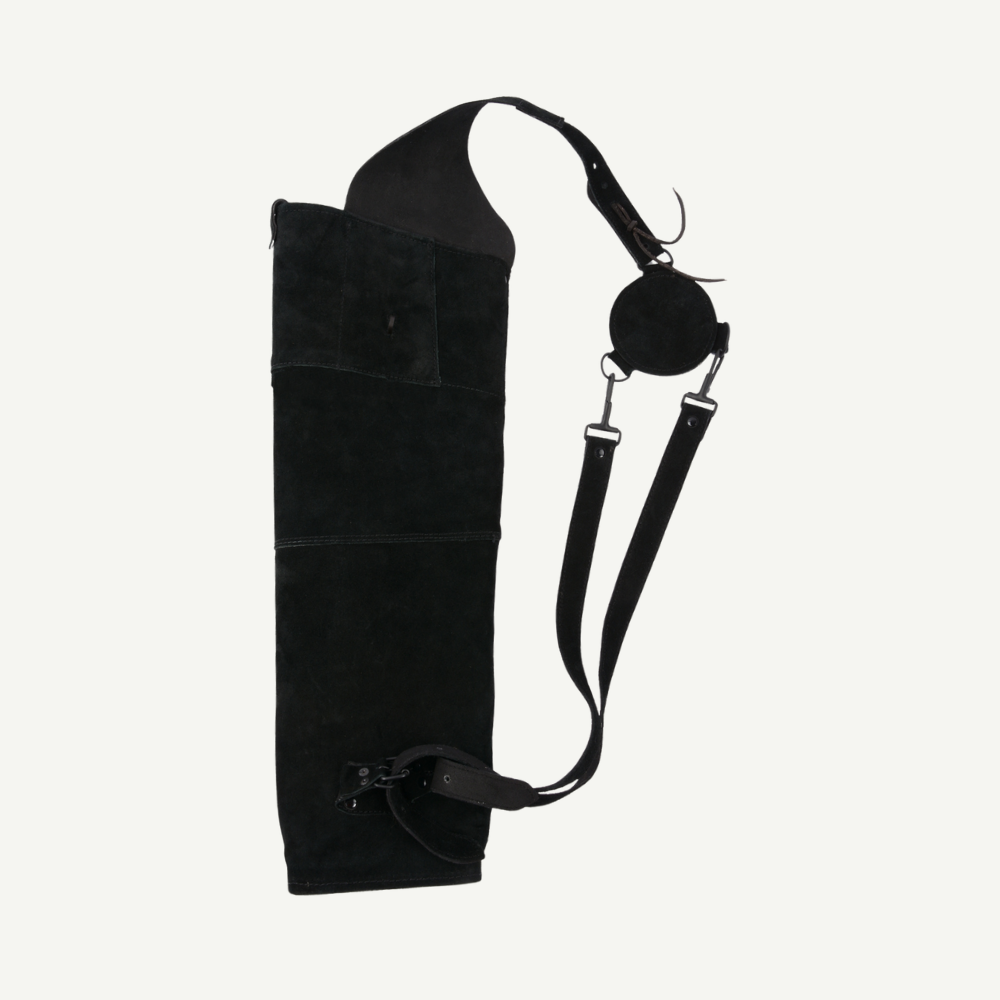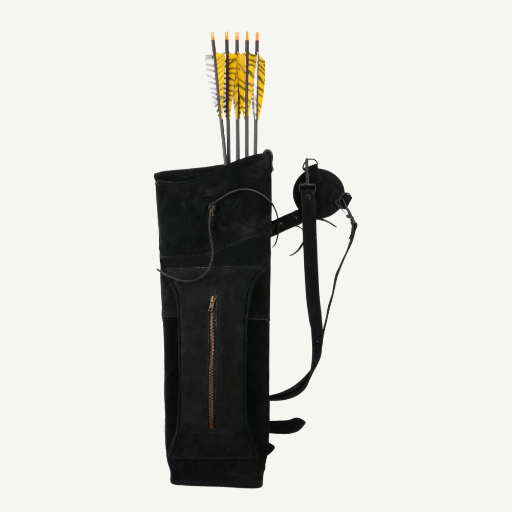 Es ist Zeit geworden, einen schönen und schwarzen Rückenköcher zu gestalten. Mit dem Raven haben wir ein altbewährtes Modell aufgegriffen und ein klein wenig abgeändert. Eigentlich ist es ja nur der Indian Summer Big in schwarzem Wildleder und ohne Fransen.